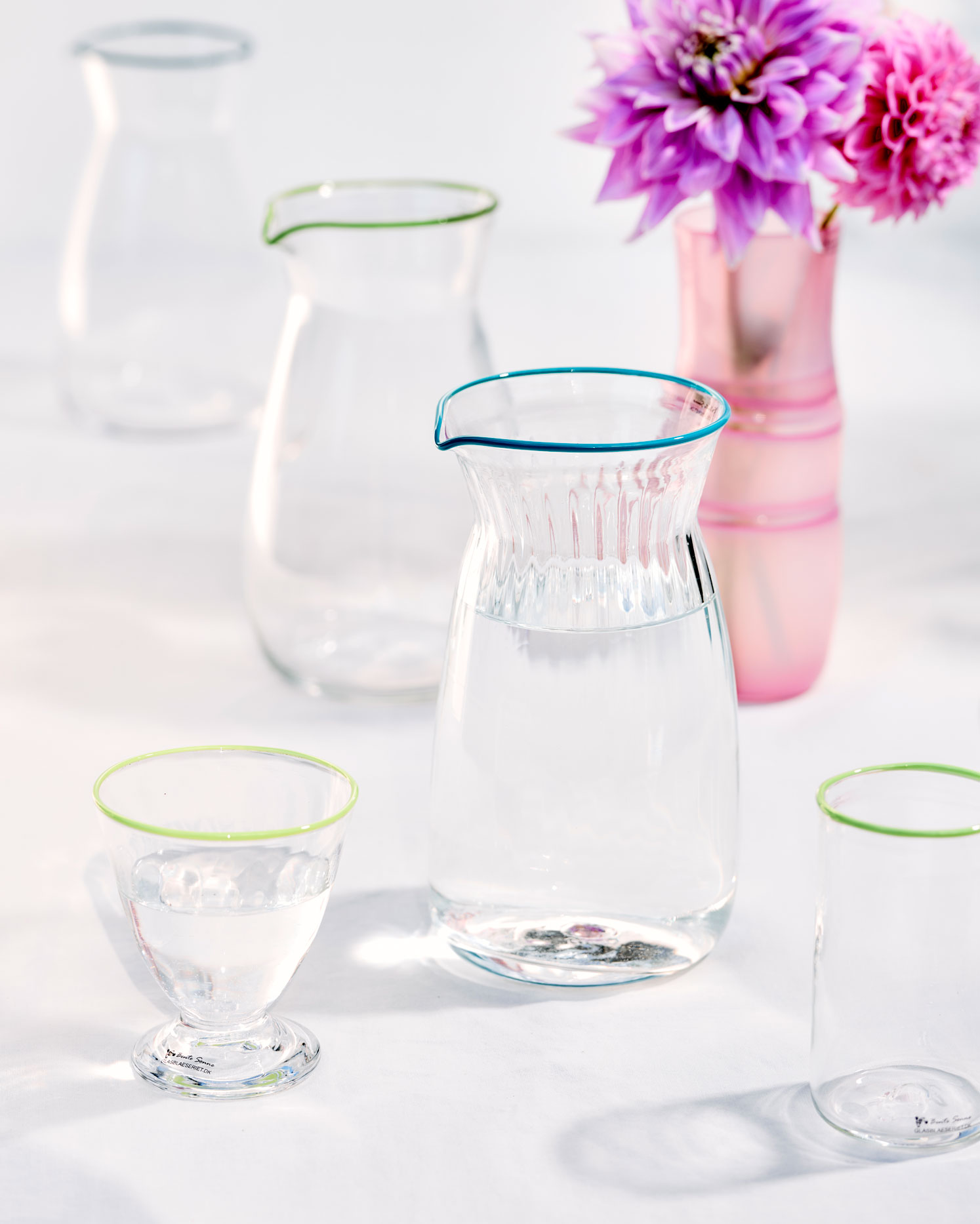 Kander med og uden optik (riller) rummer ca. 1 liter og fås i 12 forskellige farver passer til hverdagsvin glassene og vandglassene. Se farverne der. Pris 750kr.